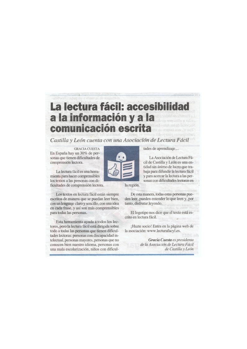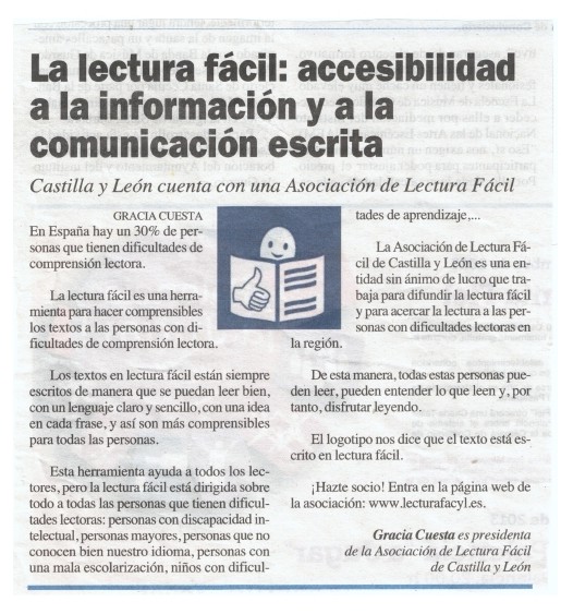 Recorte de prensa: La lectura fácil, accesibilidad a la información y a la comunicación escrita 20 noviembre, 2013 admin Noticias 0 Fuente: www.carriondigital.com