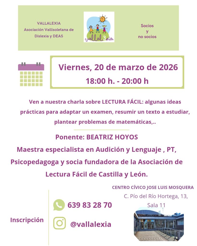 VALLALEXIA (Asociación Vallisoletana de Dislexia y DEAS) organiza una charla centrada en la metodología de Lectura Fácil, abierta tanto a socios como a personas no asociadas.