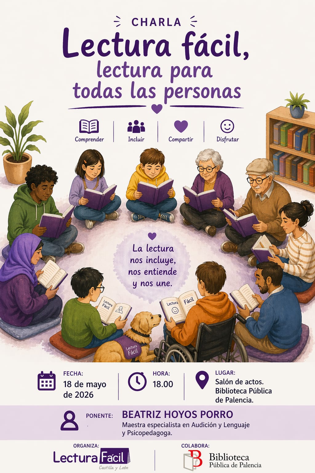 La ponencia correrá a cargo de Beatriz Hoyos Porro, maestra especialista en Audición y Lenguaje y psicopedagoga. Durante el encuentro, se abordarán los pilares fundamentales de la lectura fácil: comprender, incluir, compartir y disfrutar, todo ello bajo el lema que guía la iniciativa: "La lectura nos incluye, nos entiende y nos une".